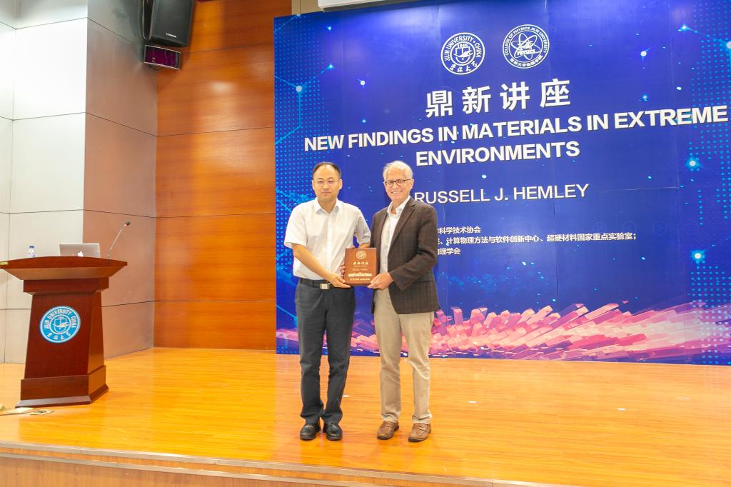 2019年8月24日,国际高压领域著名专家、美国国家科学院院士Russell J. Hemley应邀做客吉林大学鼎新讲座,在国际学术大讲堂为全校师生作题了为“New Findings in Materials in Extreme Environments”的学术报告。太阳成集团tyc7111cc院长马琰铭教授主持讲座,并为Hemley教授颁发了鼎新讲座纪念牌。