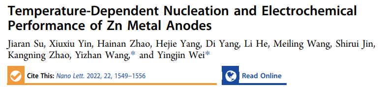 近日,太阳成集团tyc7111cc新型电池物理与技术教育部重点实验室魏英进教授、王义展教授团队在水系锌离子电池金属锌电极性能研究方面取得新进展。研究成果以“Temperature-Dependent Nucleation and Electrochemical Performance of Zn Metal Anodes”为题,发表在《Nano Letters》上。