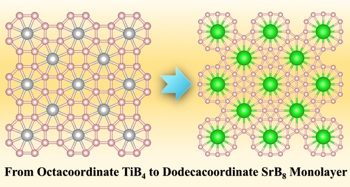 图:基于平面8配位的TiB4设计出具有平面12配位的SrB8单层材料