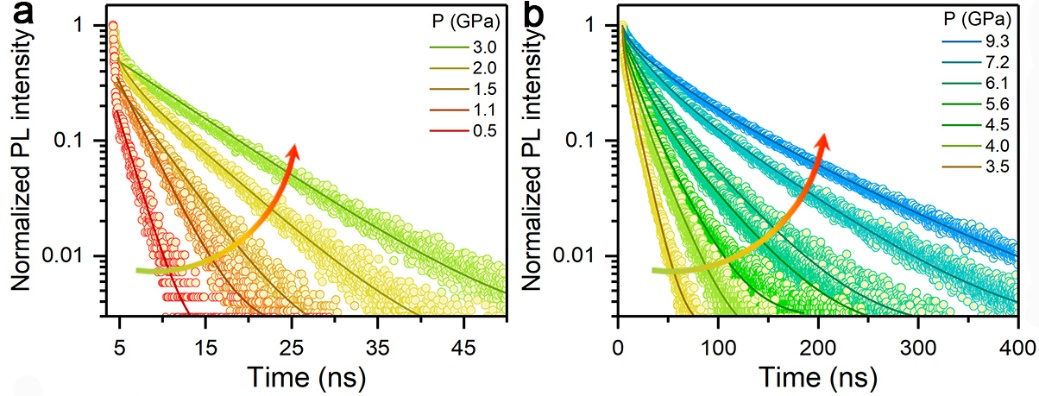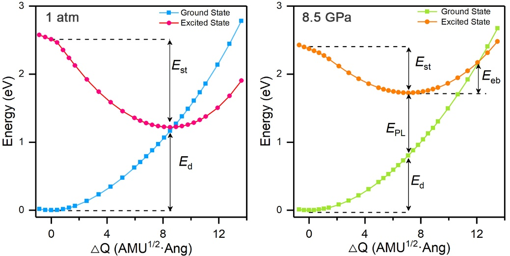 该工作观察到了压力驱动的自陷态激子从“暗态”到“亮态”的转变,对应着强的宽带斯托克斯位移发射和长的载流子寿命。进一步的理论分析表明,受抑制的晶格畸变和增强的激发态电子维度在形成稳定的亮自陷态激子中起着重要作用,它们可以分别调控自陷能和晶格形变能,在基态和激发态势能曲线之间形成能量势垒,增强电子-空穴轨道重叠。该工作提出的光物理机制突出了控制自陷态激子动力学过程和激发态行为的重要性,强调了通过控制结构刚性来调控激发态结构形变和电子-声子耦合强度以实现高效自陷态辐射复合的必要性。邹勃团队于2018年提出了压强诱导发光的概念,该工作从理论和实验出发,进一步阐明了压强诱导发光的物理化学机制,在固态照明器件的光电材料设计上有潜在的应用前景。