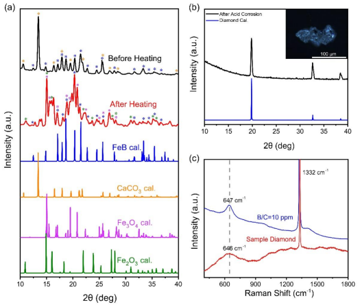 图2. (a) 加热前(黑线)和加热后(红线)样品的X射线衍射图谱。蓝线、橙线、紫线和绿线分别表示FeB、CaCO3、Fe3O4和Fe2O3的计算Bragg峰。X射线波长为0.71073 Å。(b) 经过酸蚀后合成产物的X射线衍射图谱,与金刚石的计算Bragg峰进行比较。 (c) 合成金刚石(红线)和天然含硼金刚石的光谱(蓝线)拉曼图谱对比。