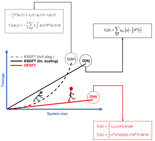 基于量子力学的第一性原理计算方法可以准确模拟出物质的微观状态以及其宏观性质。特别是Kohn-Sham密度泛函理论(KS-DFT),由于其兼具计算精度和效率,被广泛应用于物理、化学、材料等多个学科领域, 成为最具影响力的第一性原理计算方法。然而,传统KS-DFT由于需要对KS轨道的求解其计算量随模拟体系的增大呈超线性增长,导致其仅适用于模拟原子数目一般限于千原子的系统。大多数真实材料(如合金、玻璃、复合材料等)的模拟往往需要对数万甚至百万原子系统开展研究。无轨道密度泛函理论(OF-DFT), 正如其名所示,由于规避了轨道(波函数)的使用,大大简化了计算的复杂度,具有计算量线性标度的优势。因此,相比传统KS-DFT,OF-DFT使得能够探索更大的系统规模和更长的模拟时间尺度,从而可以探索新的化学现象和新材料。成为开展百万原子量级大尺度材料模拟的理想候选。同时,由于没有轨道信息,如何只根据电子密度构建准确动能密度泛函等泛函形式成为该领域的最大挑战。