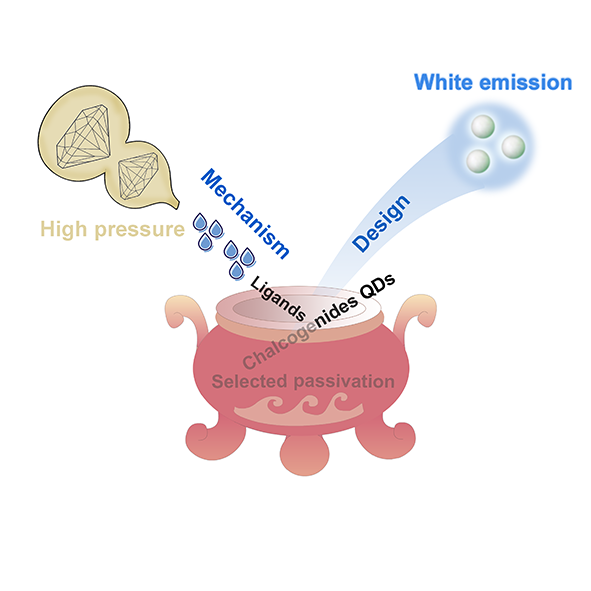 近日,吉林大学肖冠军教授等人,通过引入高压调控维度,探索不同类型(X/L/Z)配体包覆的CdS纳米晶的压力效应,成功揭示了其缺陷发光主要由表面空穴陷阱所贡献,而非辐射复合主要与表面电子陷阱有关。进一步基于高压服务常压科学的学术理念,利用高压研究阐明的物理机制指导常压合成,通过在CdS纳米晶表面掺杂具有不同缺陷能级深度的硫族阴离子消除表面悬挂Cd位点,选择性钝化与非辐射跃迁相关的表面电子陷阱,实现了CdS半导体纳米晶的缺陷发光增强和大范围精确调控,获得了高显色指数(86)的单组分“中性”白光。相关工作以“Identification of Defect Origin and White-Light Emission Tuning of Chalcogenide Quantum Dots Through Pressure Engineering”为题,发表在中国化学会旗舰刊CCS Chemistry上(CCS Chem. 2024, 10.31635/ccschem.024.202403971)。