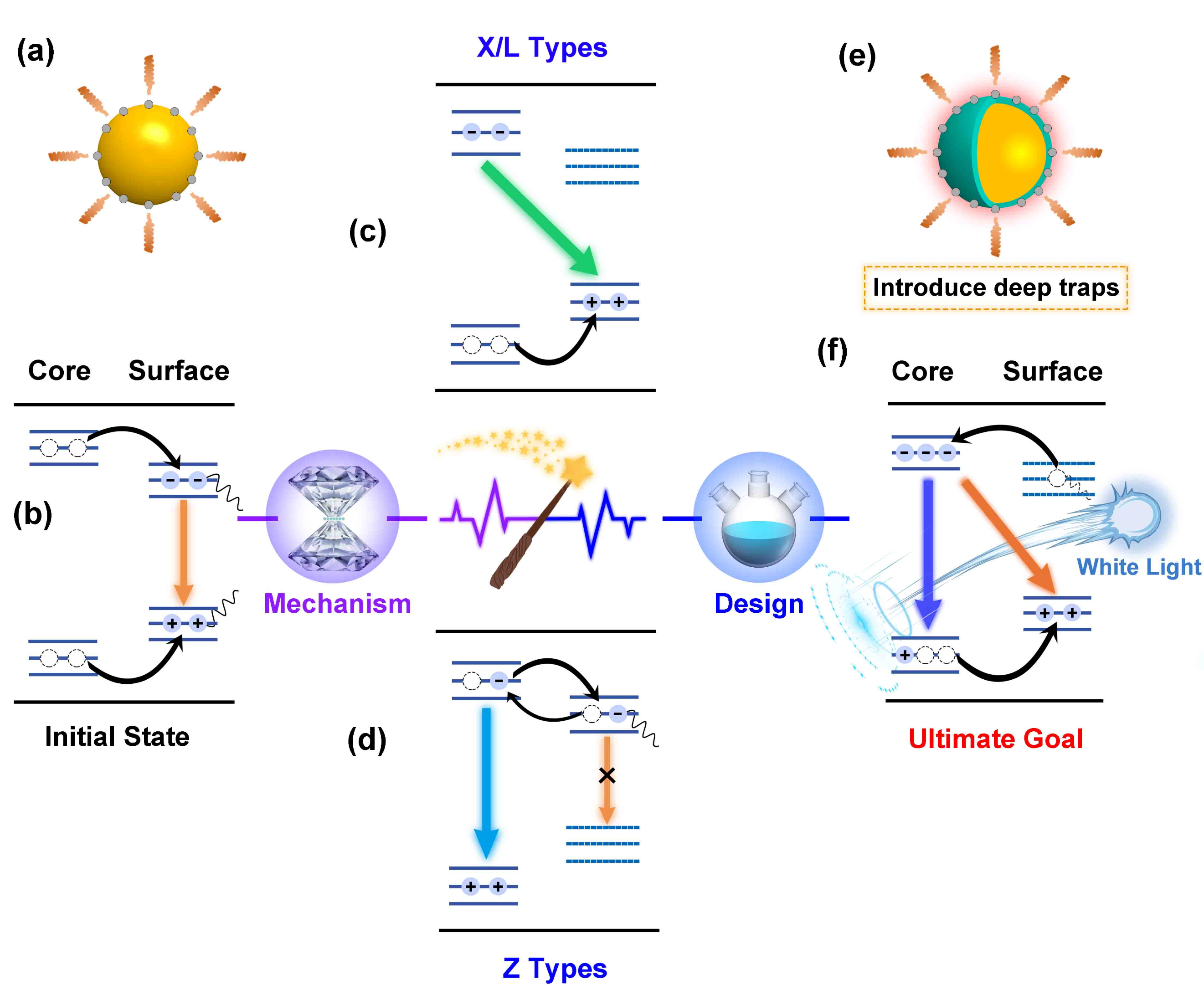 (e) 表面掺杂硫族缺陷纳米晶的简化模型;(f) 常压合成和调控纳米晶表面的缺陷发光,实现白光发射机理示意图。