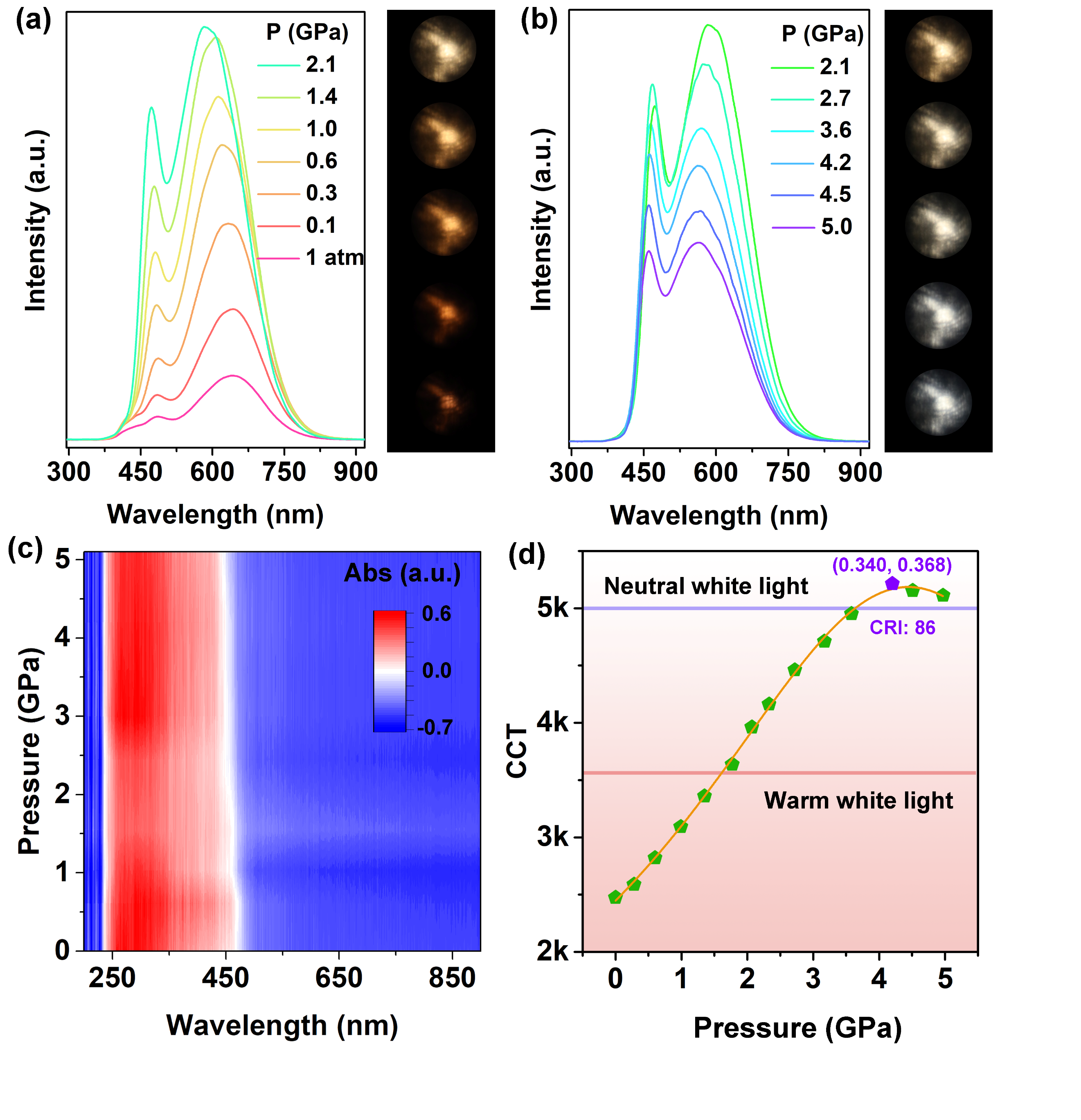 (c) CdS@CdSe纳米晶的原位高压吸收光谱;(d) 高压下CdS@CdSe纳米晶的色温演化。