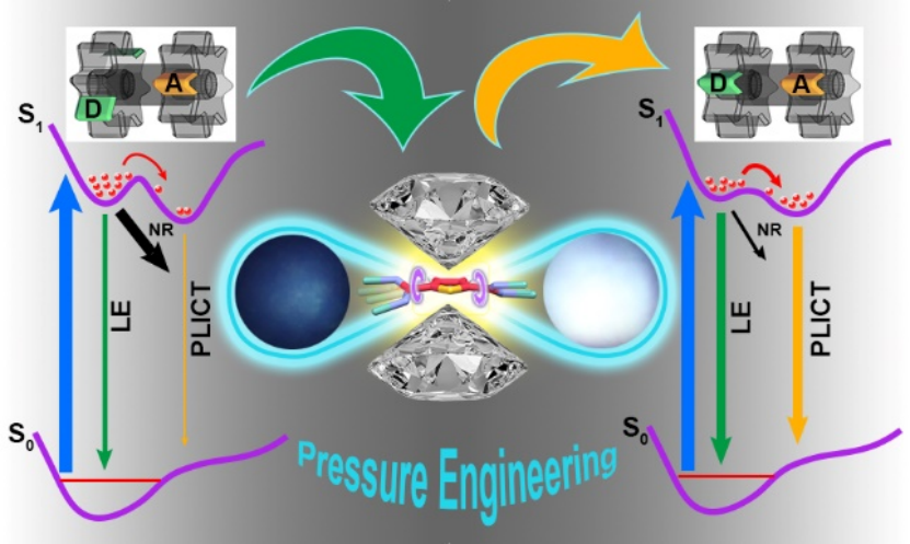 基于可设计的拓扑结构,MOFs材料能够将多个发射中心组合到单一框架上,在开发单相白光材料上具有独特的优势。目前通过封装多色客体分子或混合多种稀土离子制备白光MOFs的工艺已经比较成熟,但开发高质量的非掺杂白光MOFs仍然具有挑战性。压强作为调控晶体结构和电子结构的有效手段,已经被证实可以用于诱导材料产生优异的光学性质。在前期工作中,邹勃团队杨新一课题组利用压强处理工程调控多种MOFs结构,结合氢键协同效应在环境条件下实现了MOFs的单色发光增强(Angew. Chem. Int. Ed. 2022, 61, e202210836;Adv. Funct. Mater. 2023, 33, 2300109)和截获PIE材料的高荧光态至常压(Adv. Mater. 2023, 35, 2211729)。最近,利用压强调控IRMOF-0的有机配体羰基聚集效应,截获不同程度的跨空间n-π*相互作用,实现了环境条件下的可控多色发光(Adv. Mater. 2024, 36, 2403281)。因此,基于前期的研究,课题组提出利用压强处理策略定向调整多发射MOFs的荧光组分,实现非掺杂MOFs的高效白光发射。