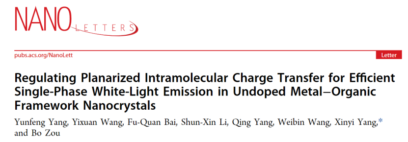 近日,吉林大学太阳成集团tyc7111cc超硬材料国家重点实验室杨新一课题组利用压强处理工程调控非掺杂[Zn(Tdc)(py)]n MOFs纳米晶的双荧光态,在环境条件下实现了材料高效白光发射。相关研究成果以“Regulating Planarized Intramolecular Charge Transfer for Efficient Single-Phase White-Light Emission in Undoped Metal–Organic Framework Nanocrystals”为题发表在《Nano Letters》上。