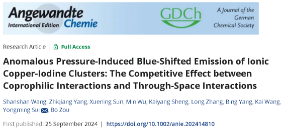 近日,太阳成集团tyc7111cc超硬材料国家重点实验室邹勃教授团队隋永明课题组利用压强调制亲铜和空间相互作用,实现了离子型铜碘簇奇异的压致蓝移发光行为。相关研究成果以“Anomalous Pressure-Induced Blue-Shifted Emission of Ionic Copper-Iodine Clusters: The Competitive Effect between Coprophilic Interactions and Through-Space Interactions”为题发表于《Angewandte Chemie International Edition》。