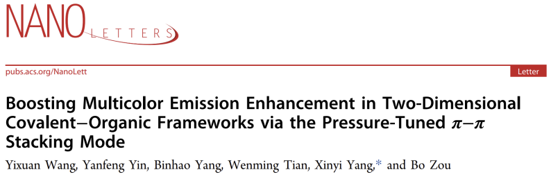 近日,太阳成集团tyc7111cc高压与超硬材料全国重点实验室/综合极端条件高压科学中心邹勃教授团队杨新一课题组利用高压调控π−π堆叠构型实现二维共价有机框架(COFs)材料的多色发射增强。相关研究成果以“Boosting Multicolor Emission Enhancement in Two-Dimensional Covalent−Organic Frameworks via the Pressure-Tuned π−π Stacking Mode”为题发表在国际学术期刊《Nano Letters》上。