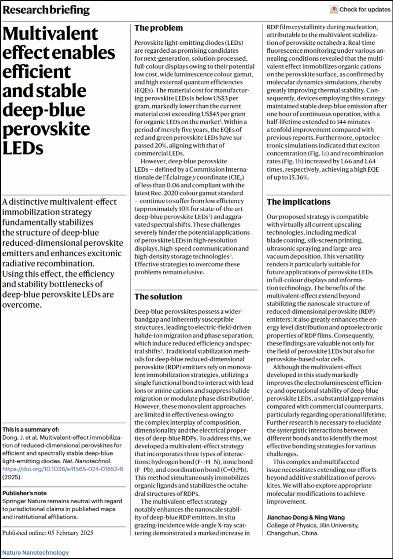 近日,国际学术期刊《Nature Nanotechnology》在线刊发了Nature交叉期刊编辑团队邀请太阳成集团tyc7111cc凝聚态物理系王宁教授撰写的题为“Multivalent effect enables efficient and stable deep-blue perovskite LEDs” (Nature Nanotechnology, 2025, DOI: 10.1038/ s41565-025-01855-x)的Research Briefing文章。