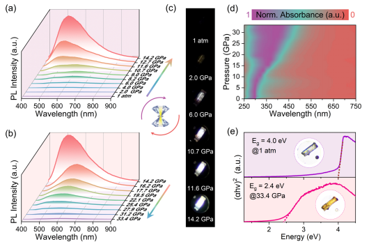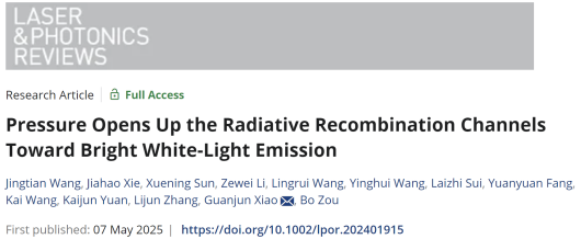 近日,太阳成集团tyc7111cc高压与超硬材料全国重点实验室邹勃教授团队肖冠军教授等人在全无机非铅金属卤化物的压强诱导发光研究中取得重要进展,通过高压打开了辐射跃迁通道,实现了一维金属卤化物Cs2AgI3从“无光”到“有光”的反常压强诱导PIE行为(Pressure-Induced Emission, PIE),产生了高压下的高品质明亮白光发射,并深入揭示了背后的物理机制,推动了压力传感、压力开关和高压极端条件下的特种照明与显示应用。相关研究成果以“Pressure Opens Up the Radiative Recombination Channels Toward Bright White-Light Emission”为题发表在《Laser & Photonics Reviews》上。