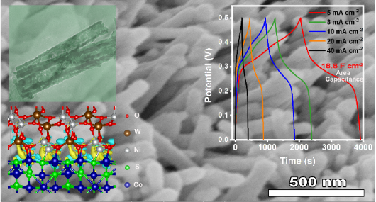 电极是重要储能装备-超级电容器的核心组成部分,是决定其综合性能的关键因素之一。硫系Co9S8电极具有相对较高的金属含量和丰富价态,容量高,是广泛关注的超级电容器电极材料,但Co9S8通常存在离子迁移速率低、循环稳定性差等问题。金属氧化物电极材料(如NiWO4)具有电导率高、价态丰富和离子迁移速率高等优点,但容量低。结合两者的优点,将Co9S8和NiWO4复合形成异质结构,是实现高性能超级电容器的候选电极。