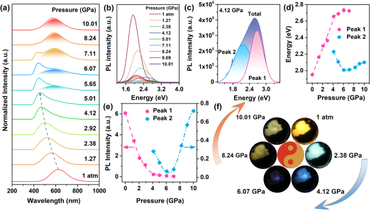 其中di是从Bi到第i个配位Cl原子的距离,n是配位数(n=6)。高压下D值逐渐增加。当压力增加到6.04 GPa后,扭曲度D值基本保持不变。这一结果进一步证实了高压下发生了更强的晶体场劈裂,因此导致高压下发光红移。高压下晶体场强度和宽发射波长之间的负相关性,排除了宽发射源于Bi3+从3Pn(n=0,1,2)到1S0跃迁,从而为其宽发射源于自陷态激子辐射复合提供有力的压力依据。