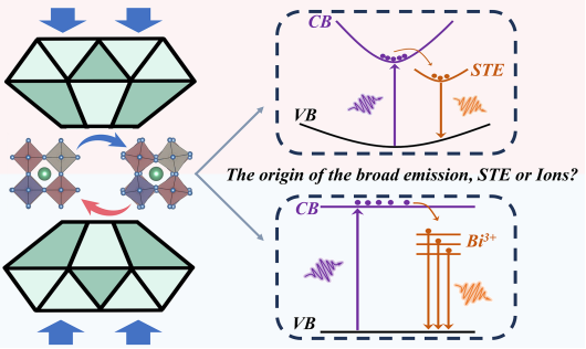 近日,太阳成集团tyc7111cc高压与超硬材料全国重点实验室邹勃教授团队肖冠军教授等人,通过引入高压维度,探索合金双钙钛矿Cs2AgIn0.9Bi0.1Cl6纳米晶宽辐射发光的压力响应,成功揭示了高亮度宽辐射发光主要源于自陷态激子发光,而非ns2电子组态的金属Bi3+离子发光,解决了长期以来关于Cs2AgIn0.9Bi0.1Cl6纳米晶宽辐射发光起源的争议。研究表明,宽辐射发光包含了两种自陷态,分别与BiCl6-AgCl6和InCl6-AgCl6两种八面体结构有关。高压下晶体场强度和宽发射波长之间的负相关性,排除了宽发射源于Bi3+从3Pn(n=0,1,2)到1S0跃迁,从而为其宽发射源于自陷态激子辐射复合提供有力的压力依据,进一步加深了对铟基双钙钛矿光物理机制的理解,促进高压为常压科学服务。相关工作以“Self-Trapped Excitons or Bi3+ Ions for Broad Emission in a Lead-Free Double Perovskite? Hearing What Pressure Says”为题,发表在《Nano Letters》上。