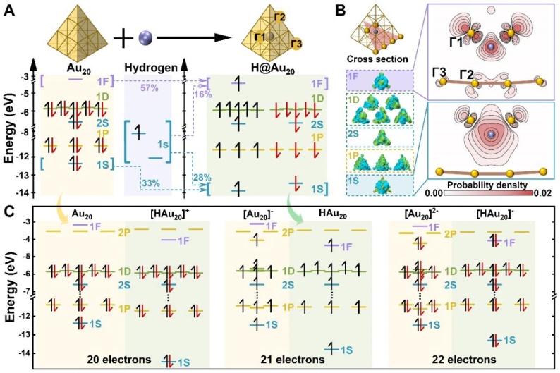 图1. 结构与能级图。(A) Au20和H@Au20优化结构的示意图(Γ1表示面心金原子,Γ2表示棱边金原子,Γ3表示顶角金原子),以及它们的超原子分子轨道能级图和相应的轨道成分分析。(B) H@Au20中氢原子贡献显著的轨道概率密度分布。超原子分子轨道的等值面取值为0.01。(C) Au20和[H@Au20]+(20电子超原子)、[Au20]-和H@Au20(21电子超原子)、[Au20]2-和[H@Au20]-(22电子超原子)的能级图。所有体系的能级均以Au20的2S轨道为基准进行对齐校准。校准因子分别为:[H@Au20]+,+2.94 eV;[Au20]-,-2.67 eV;H@Au20,+0.11 eV;[Au20]2-,-5.41 eV;[H@Au20]-,-2.70 eV。图底部标注的电子数代表超原子电子数目。20电子和22电子超原子为闭壳层结构,21电子超原子为开壳层结构。(1F仅代表1Fxyz轨道。)