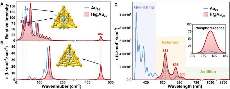 图3. 振动光谱、紫外-可见吸收光谱与磷光发射光谱。(A) Au20和H@Au20的拉曼光谱及(B) 红外光谱。图中标注了两个特征峰对应的振动模式。(C) 经自旋轨道耦合校正的Au20和H@Au20紫外-可见吸收光谱与磷光发射光谱。"ε"表示摩尔吸光系数。