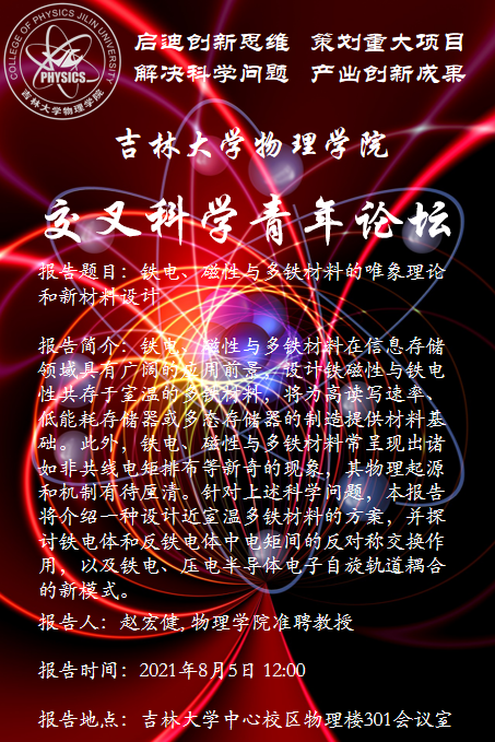 赵宏健,太阳成集团tyc7111cc准聘教授,长期致力于铁电、磁性与多铁材料的理论研究,设计了一系列铁电、磁性与多铁新材料,并针对非共线磁矩/电矩结构、磁致铁电性和磁电耦合等现象建立了相关唯象理论,在Nature Materials,Nature Communications,Physical Review Letters和Physical Review B等期刊共发表论文40余篇。