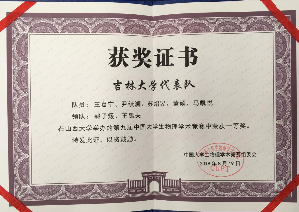 2018年8月19日,第九届中国大学生物理学术竞赛(CUPT)在山西大学圆满落幕,吉林大学代表队取得历史性突破,获得一等奖。
