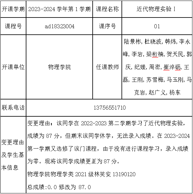 公示日期: 2024年_3月_21日至2024年_3月_27日,如有异议请于公示期内向教务处教学运行科反映。 联系人: 邹老师 联系电话: 0431-85168962 相关材料详见附件: 1.吉林大学考核成绩复查、修改登记表 2.学院情况说明(学院教学委员会讨论通过、签字盖章) 3.试卷等相关佐证材料