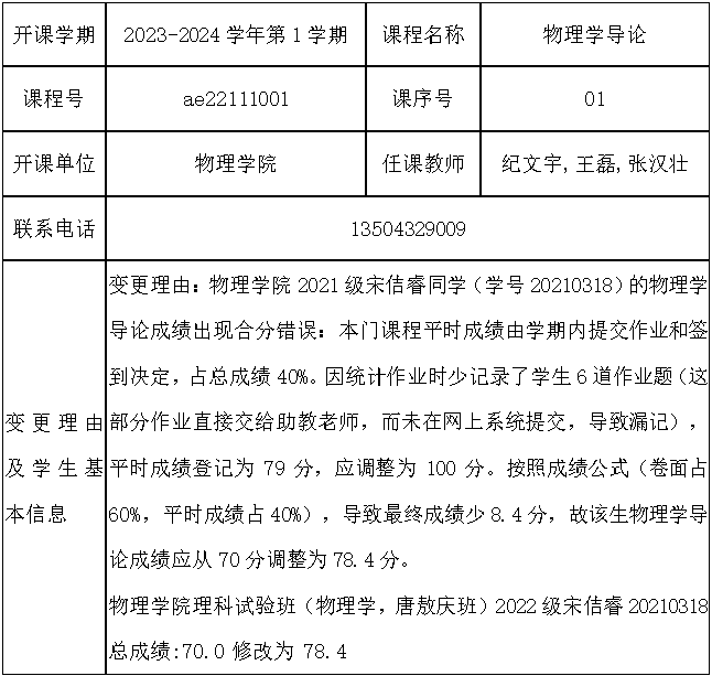 公示日期: 2024年_3月_21日至2024年_3月_27日,如有异议请于公示期内向教务处教学运行科反映。 联系人: 邹老师 联系电话: 0431-85168962 相关材料详见附件: 1.吉林大学考核成绩复查、修改登记表 2.学院情况说明(学院教学委员会讨论通过、签字盖章) 3.试卷等相关佐证材料