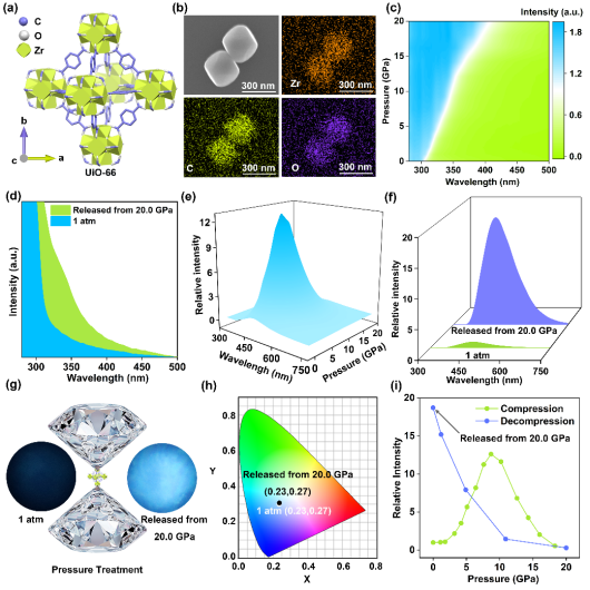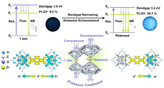 在本工作中,杨新一教授课题组提出利用压强处理策略调控UiO-66的光学性能。20.0 GPa压强处理后,UiO-66的带隙从初始的3.9 eV降低至3.2 eV,同时光致发光量子产率从8.0%提升至36.7%。结构表征与理论计算表明,高压诱导UiO-66中高对称的八面体次级结构单元(SBUs)发生畸变,打破了原有的结构对称性。这种结构扰动增强了局域SBUs中氧原子与配体间的轨道重叠及电子耦合,降低体系能级结构并促进电荷转移跃迁,实现UiO-66带隙窄化与发光增强。本研究为调控材料的带隙结构、优化电荷转移路径和改善发光性能提供了新思路。