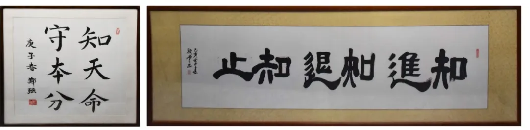 图6 左图:“知天命 守本分”郑强教授书;右图:“知进 知退 知止”段雪院士书。