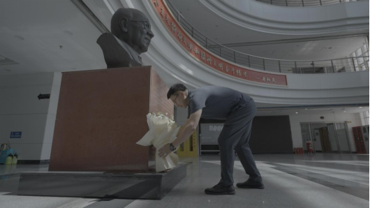 十一时许,王强先生缓步走进唐敖庆楼二层大厅,在余瑞璜先生塑像前肃立默哀。他轻轻整理花束,以洁白鲜花表达对亲人的追思与对科学先驱的崇高敬意,并面向雕像郑重三鞠躬,深切缅怀这位中国金属物理学的开拓者。
