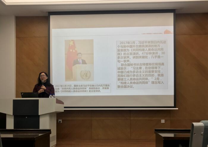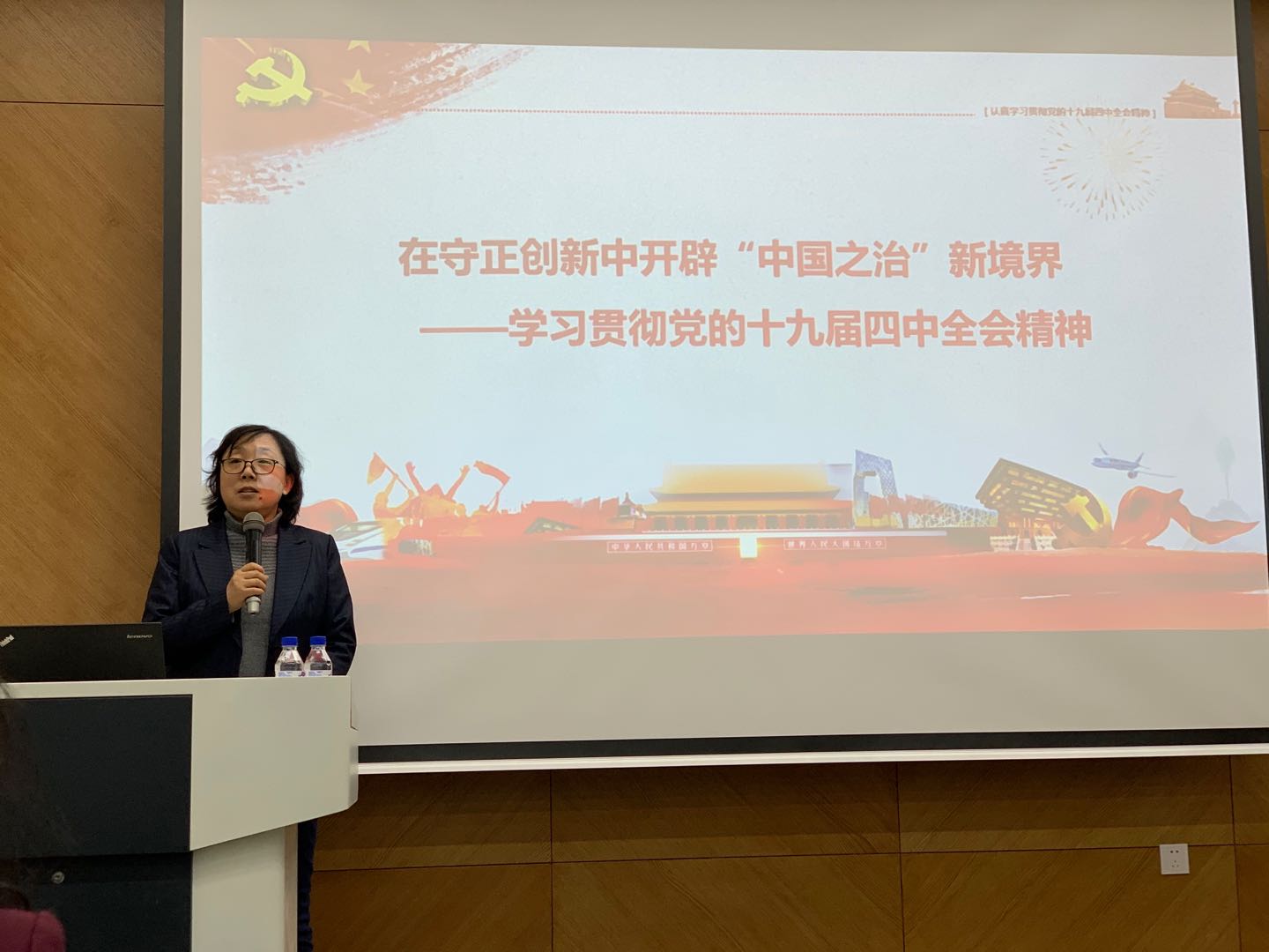 2019年12月11日下午,马克思主义学院副院长石瑛教授在物理楼333报告厅为太阳成集团tyc7111cc班子成员、党委委员、纪委委员、全体教工党员、学生党支部支委和学生党员代表作“在守正创新中开辟‘中国之治’新境界——学习贯彻党的十九届四中全会精神”专题辅导报告,报告会由学院党委书记孟文卓主持。