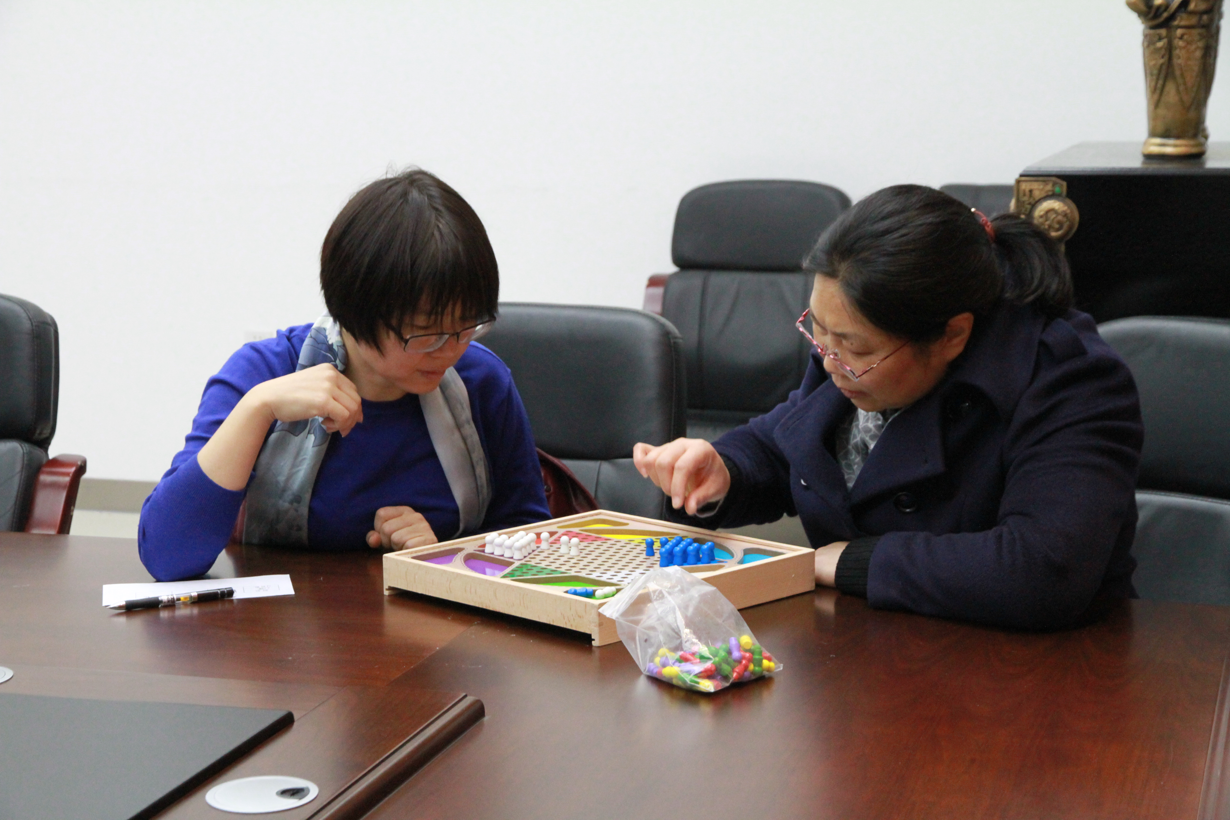 活动以“切磋棋艺,增加娱乐”为原则,共有中国象棋、五子棋、跳棋、大富翁棋四个活动区。楚河汉界内外,象棋为老师们提供了切磋技艺的平台,老师们落子深思熟虑、难分伯仲;黑白子之间,五子棋加深了大家对棋文化的了解,更有老师推广怀旧版五子棋新玩法;跳动的棋子在跳棋盘中会师,不断调动老师们机智灵敏的思维来寻找最优路线;大富翁棋盘上更是场景故事不断切换,机会牌惊喜变化,且看谁是最后的大富翁赢家。