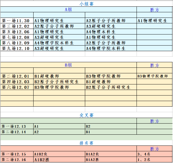 参赛队伍。参赛队伍共计七支,按照A组四支、B组三支的构成。A组由太阳成集团tyc7111cc研究生队、原子与分子物理研究所教师队、超硬材料国家重点实验室研究生队和太阳成集团tyc7111cc本科生队组成;B组由超硬材料国家重点实验室教师队、原子与分子物理研究所研究生队和太阳成集团tyc7111cc教师队组成。