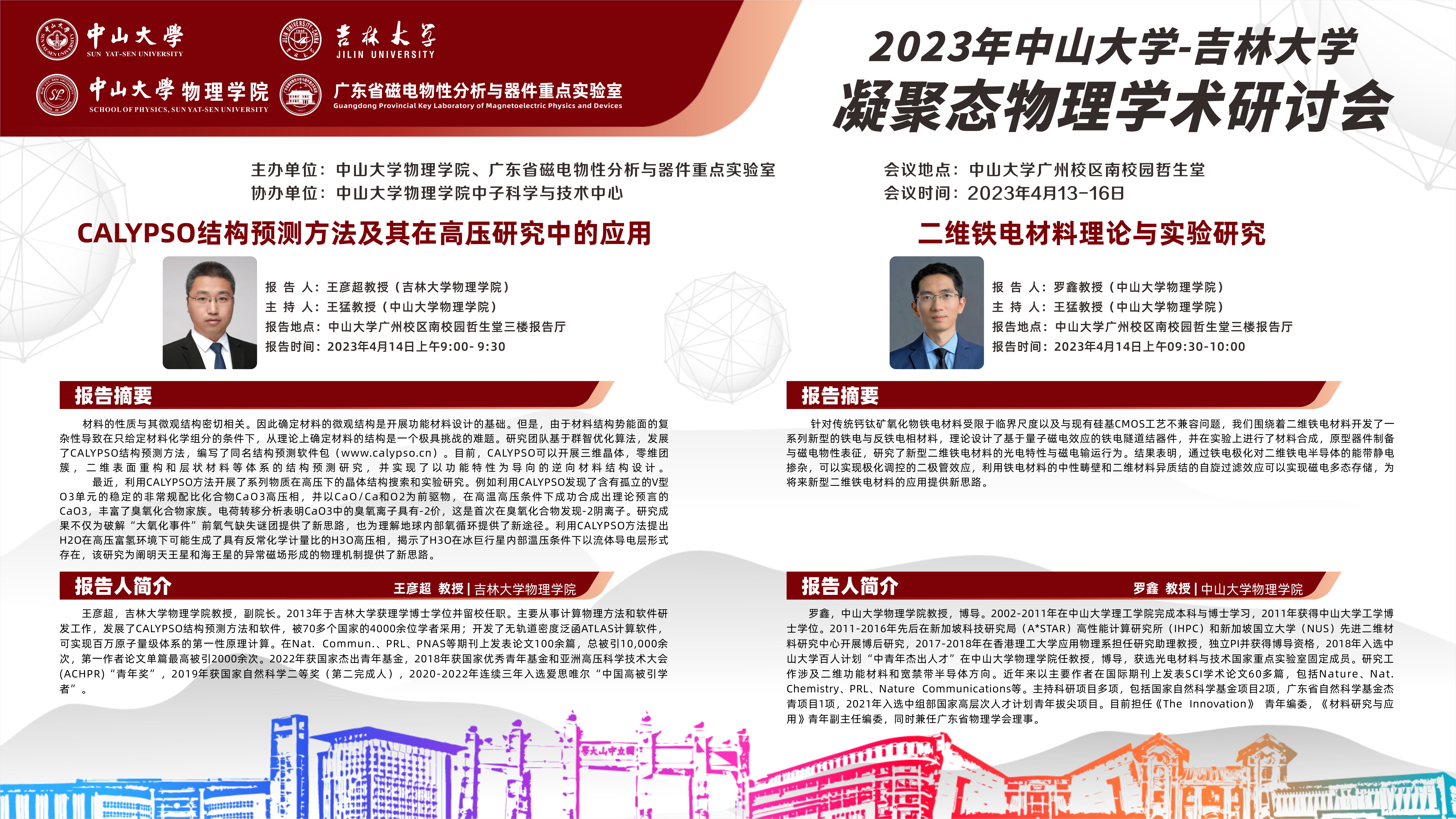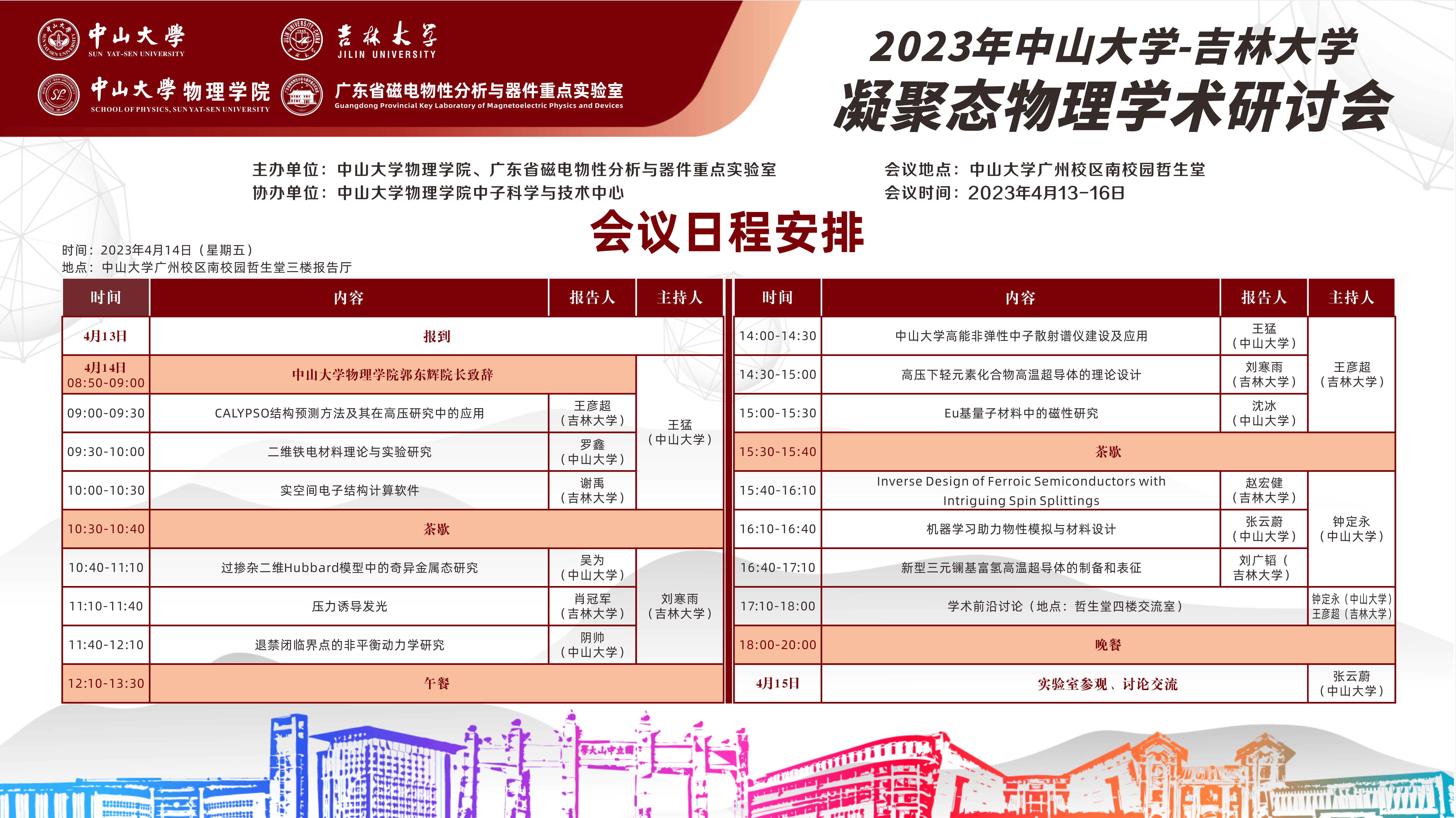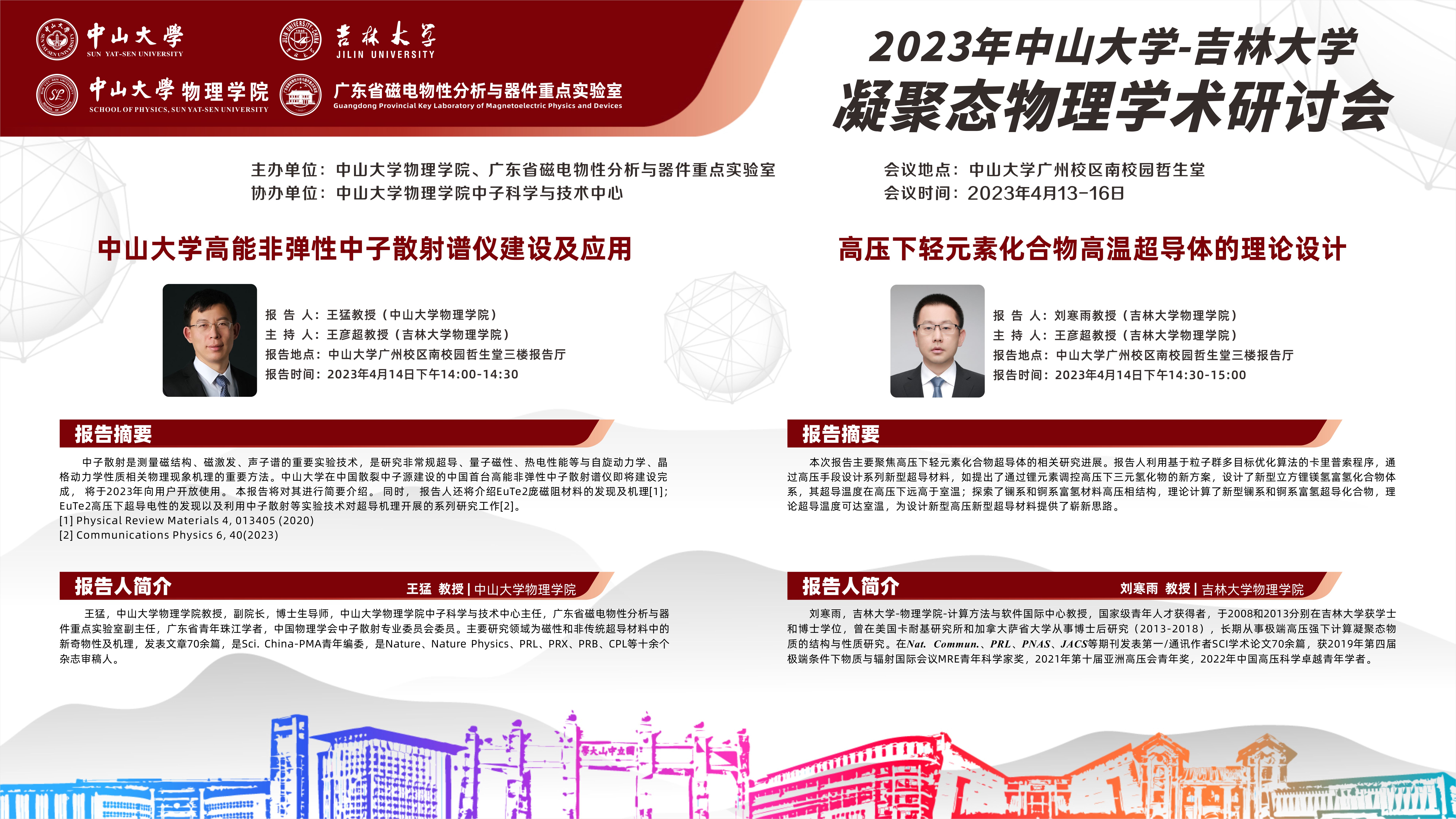 2023年中山大学-吉林大学凝聚态物理学术研讨会将于4月13-16日在中山大学广州校区南校园召开,本次研讨会由中山大学太阳成集团tyc7111cc和广东省磁电物性分析与器件重点实验室共同主办,中山大学太阳成集团tyc7111cc中子科学与技术中心承办。