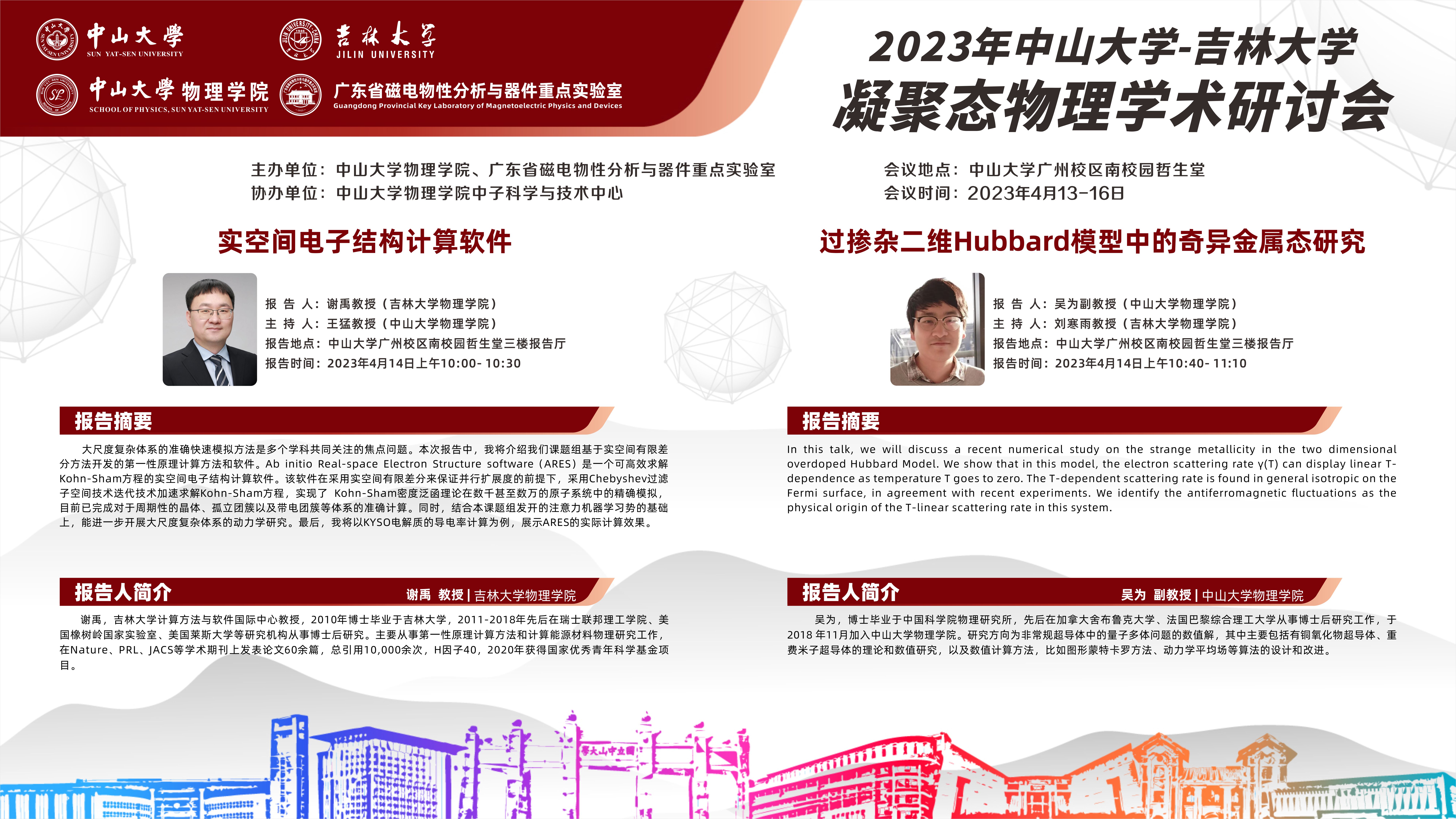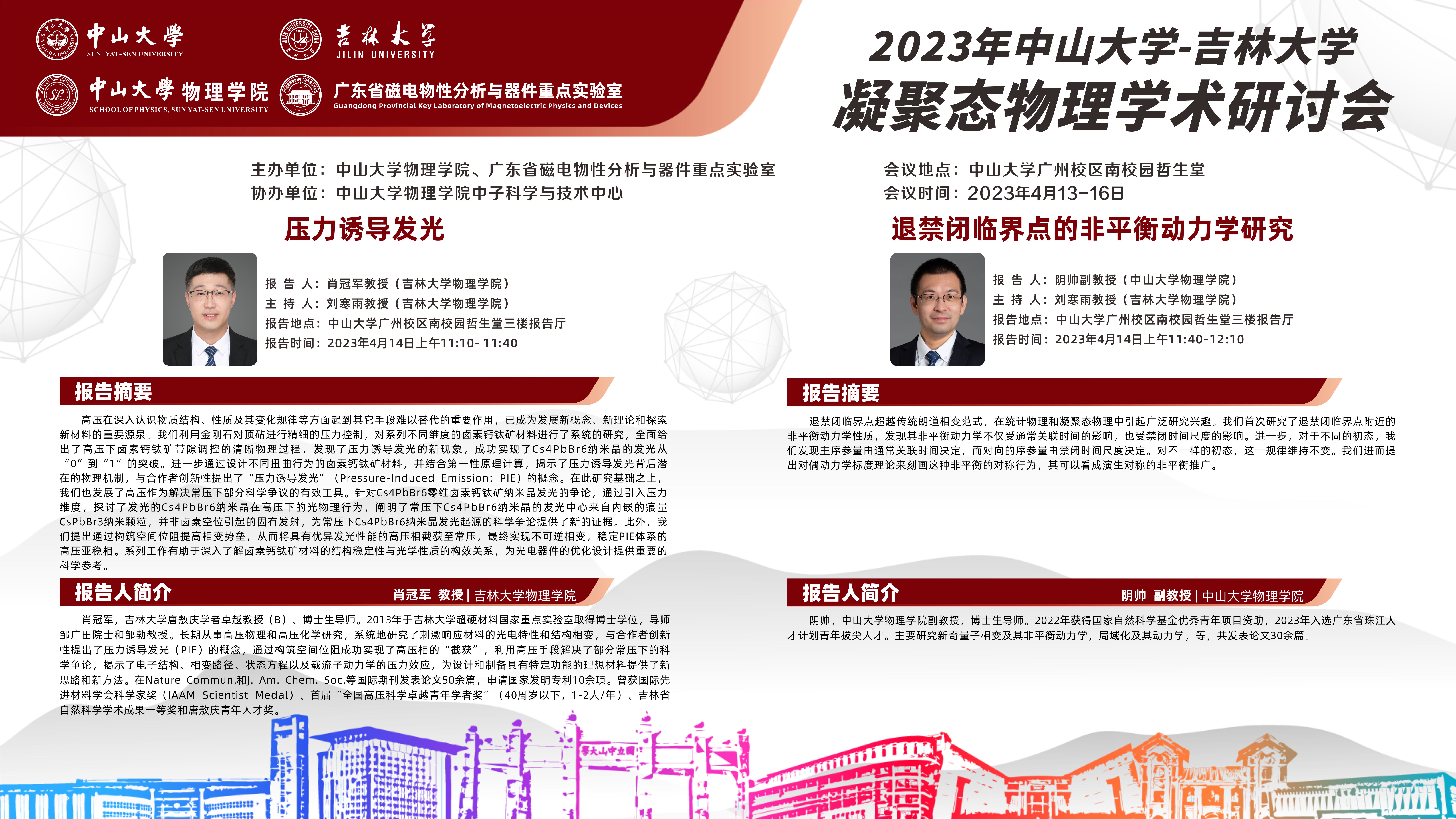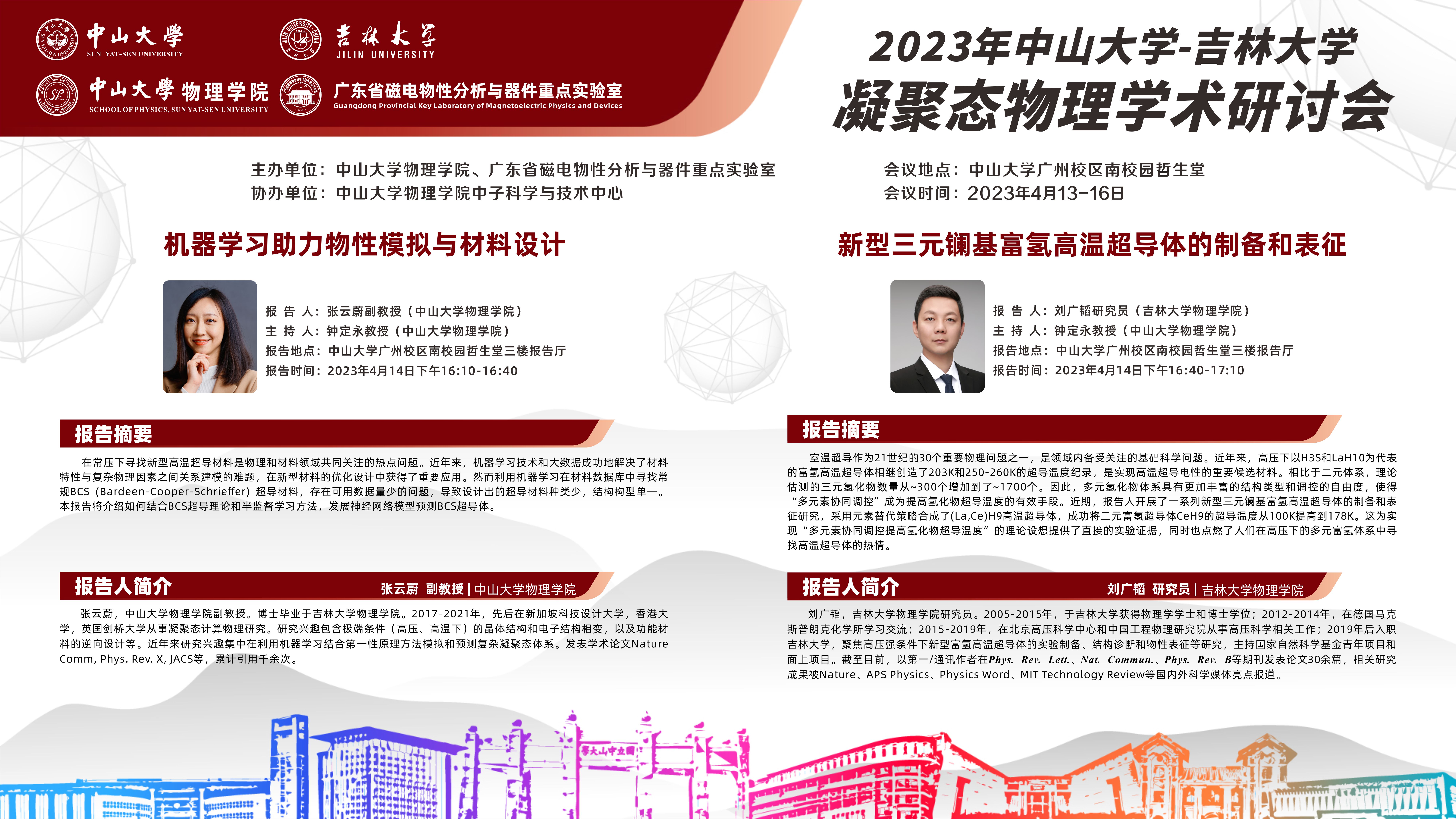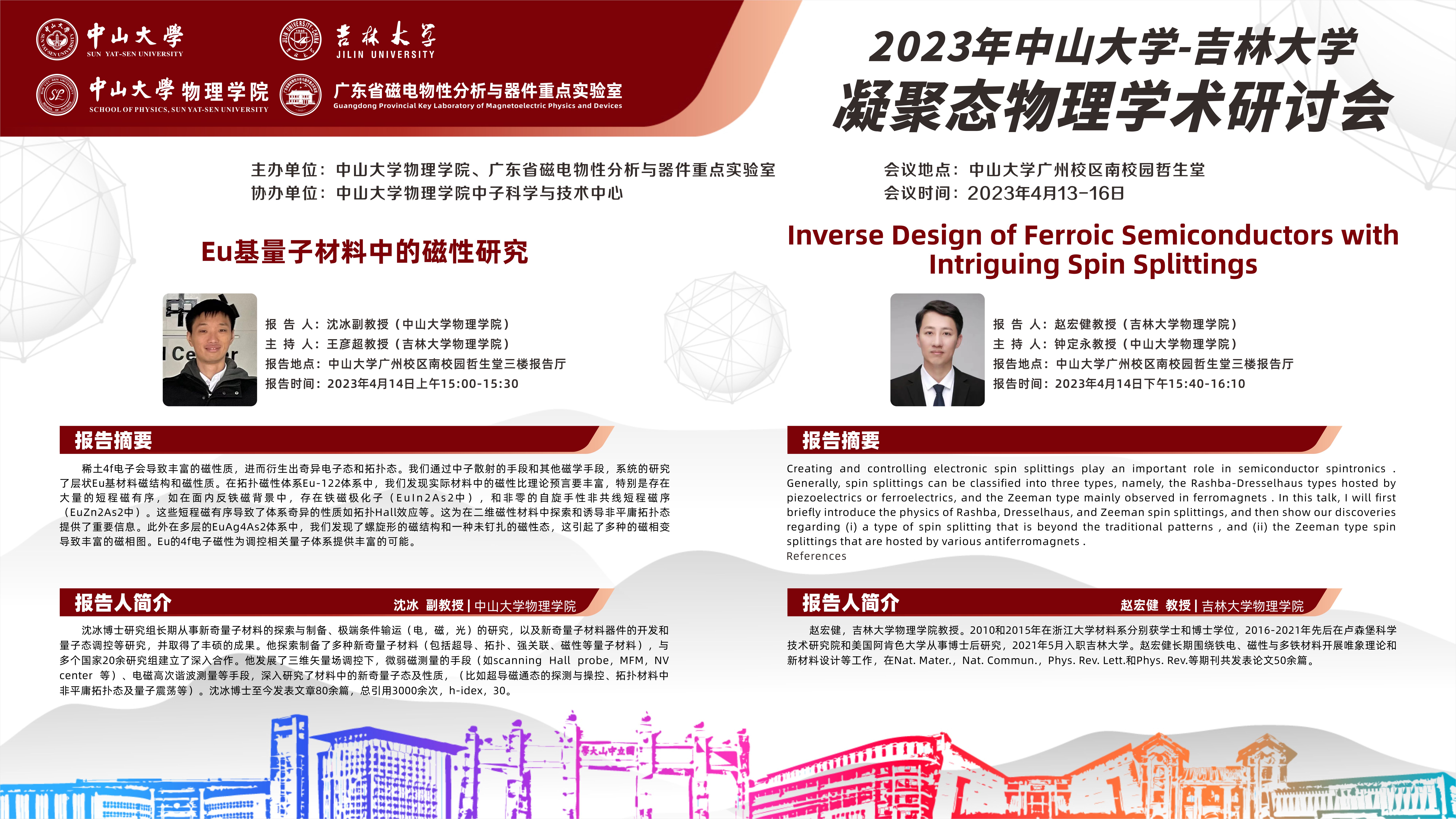2023年中山大学-吉林大学凝聚态物理学术研讨会将于4月13-16日在中山大学广州校区南校园召开,本次研讨会由中山大学太阳成集团tyc7111cc和广东省磁电物性分析与器件重点实验室共同主办,中山大学太阳成集团tyc7111cc中子科学与技术中心承办。