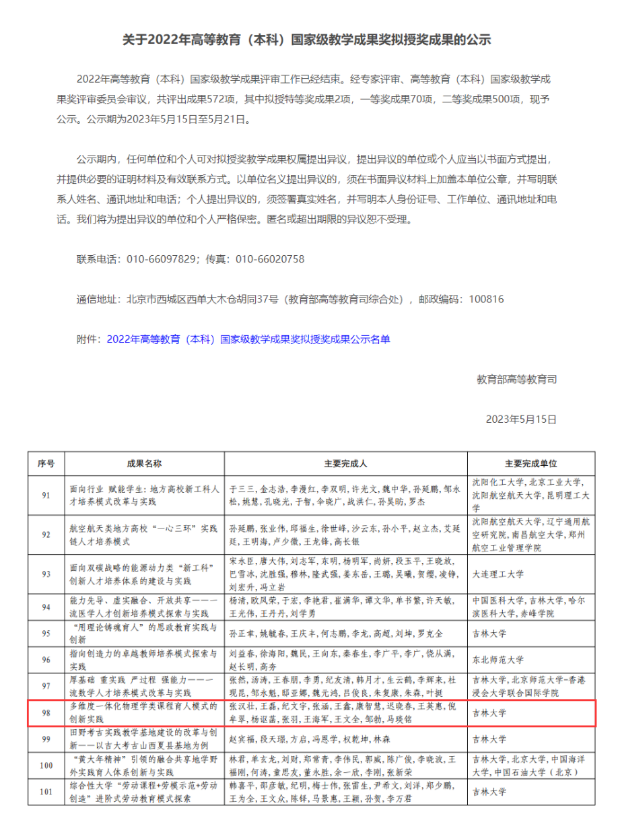 2023年5月15日,教育部公示了2022年高等教育(本科)国家级教学成果奖拟授奖成果名单。我院张汉壮教授主持完成的“多维度一体化物理学类课程育人模式的创新实践”喜获国家级教学成果奖二等奖!