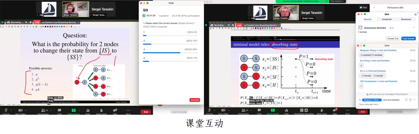本期线上课程分为5节,共计10小时,由国际著名理论物理学家、剑桥大学圣凯瑟琳学院院士Sergei Taraskin教授亲自设计并授课,太阳成集团tyc7111cc共有来自三个年级的74名本科生参加。通过随机场伊辛模型、格子气体模型、流行病模型完成了统计物理学科20多个知识点的学习,让学生们不出国门亦可获得国际顶级学府全真课堂的体验。课程以讲座及互动学习的方式给学生启发、思考,并在全英文的环境中掌握核心专业知识和思维逻辑,为学生未来学业和职业生涯开启预热准备、打实坚固的基础。