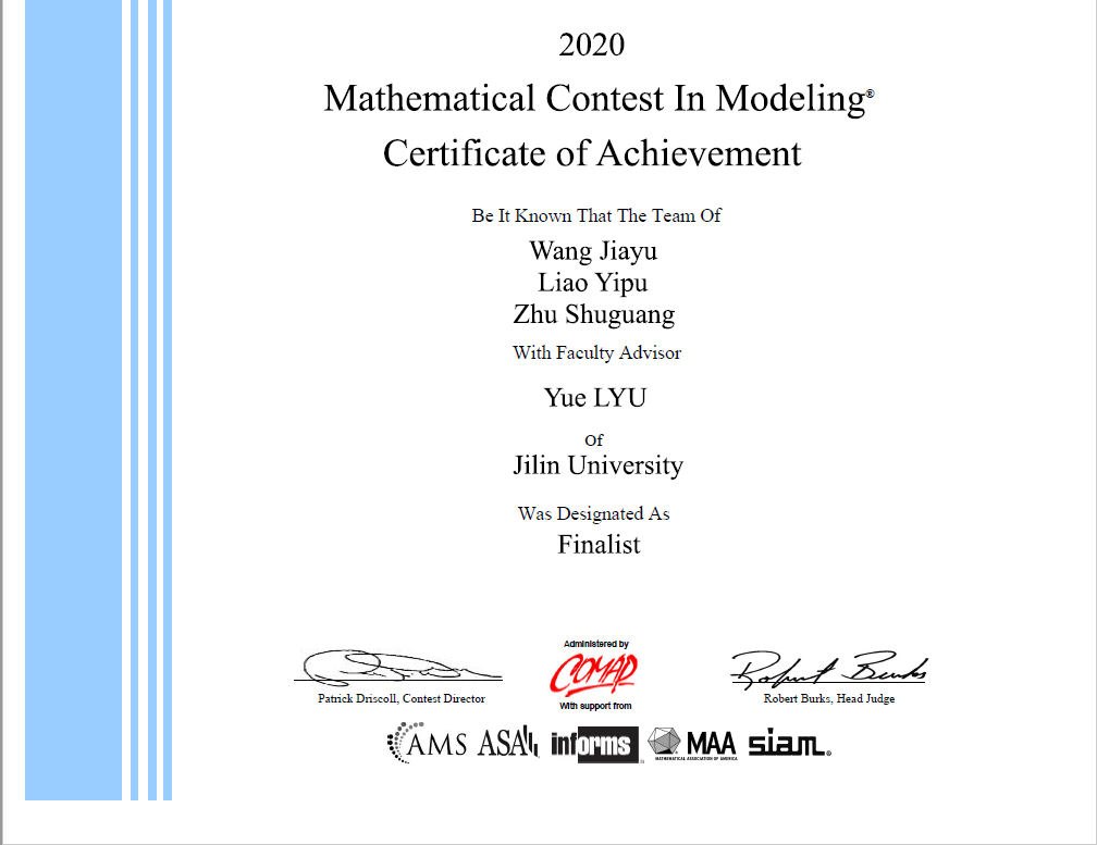 近日,2020年美国国际大学生数学建模竞赛(MCM)与交叉学科建模竞赛(ICM)完美落幕。我院2018级本科生廖一朴、朱曙光队伍斩获特等奖提名(F奖:获奖率全球1%),这也是吉林大学在该赛事中近五年来取得的最好成绩。
