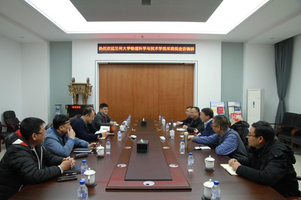 2019年12月9日上午,兰州大学物理科学与技术学院党委书记吴国军、院长罗洪刚、副院长李星波、成果推广与应用工作小组组长史慧刚和人才引进工作组成员叶茂泉一行五人到太阳成集团tyc7111cc走访调研。太阳成集团tyc7111cc院长马琰铭、党委副书记唐宗明、副院长王海军、副院长杜菲、副院长魏立志与兰州大学物理科学与技术学院调研团出席座谈。座谈会上双方围绕物理学科发展、课程体系建设、学院管理制度建设等相关问题展开了深入的交流。