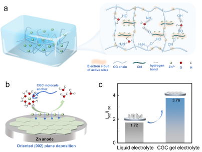 基于此,该工作利用壳聚糖和叶绿素衍生物天然生物材料设计了一种具有多重分子锚的新型凝胶电解质(CGC凝胶电解质)。结合实验结果和第一性原理计算发现,CGC凝胶电解质通过三元氢键牢固地锚定了水分子,降低了水分子的活性,有效抑制了析氢反应。同时,多重带电官能团实现了锌离子的梯度诱导和再分配,引导Zn定向(002)面沉积,获得了无枝晶锌负极。因此,该凝胶电解质展现了1700 h的长循环寿命和99.4%的库伦效率。以0.5 A g-1在Zn||V2O5全电池中循环600圈后获得了81.7%的容量保持率,同时在软包电池中也展现了一定的柔韧性。该凝胶电解质策略为实现高度可逆锌负极提供了理论参考。