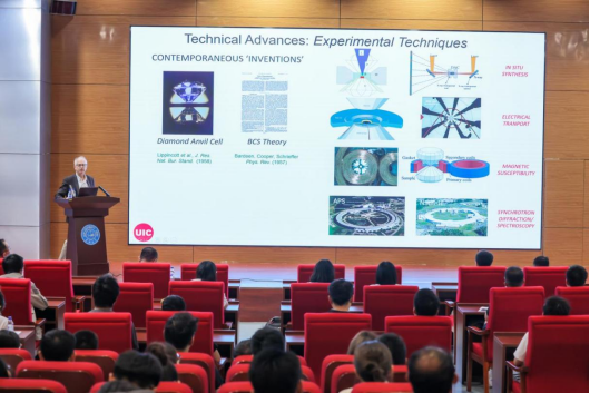 2025年5月30日上午,美国科学院院士、伊利诺伊大学芝加哥分校Russell J. Hemley教授应邀在吉林大学中心校区国际学术大讲堂做客吉林大学鼎新讲座。Hemley教授以“Progress in High Tc Superconductivity Under Pressure”为题,为学校师生带来了一场前沿学术盛宴。