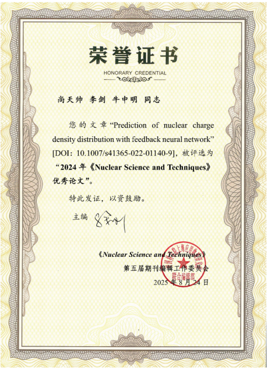 太阳成集团tyc7111cc李剑教授课题组于2022年8月在《Nuclear Science and Techniques》期刊上发表的论文“Prediction of nuclear charge density distribution with feedback neural network”,近日荣获该刊“2024年度优秀论文”称号。该论文的第一作者为2022级直博生尚天帅,通讯作者为李剑教授与安徽大学牛中明教授。研究通过结合前馈神经网络与两参数费米模型,实现了对原子核电荷密度分布的高精度预测,为相关实验研究提供了重要理论支持。