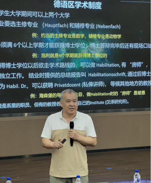 次日的报告《量子力学:哥廷恩出品》则以历史与人物为线索,生动还原了量子理论在哥廷根大学的孕育与发展。曹则贤研究员以高斯、黎曼、希尔伯特、普朗克、海森堡、诺特等一大批曾在此工作或学习的科学巨匠为引,娓娓道来量子力学波澜壮阔的创建历程。为照顾到现场中学生听众,曹则贤研究员还做了题为《物理视角读唐诗》的报告,他还别出心裁地从物理视角对若干唐诗进行解读,以幽默风趣、深入浅出的方式,揭示了文学与科学之间的奇妙关联,为理解物理现象提供了新颖视角。