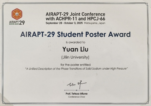 该奖项在本届大会上仅授予10名学生,刘源是其中唯一来自中国的获奖者。他的获奖,体现了吉林大学在高压物理领域扎实的人才培养水平与不断提升的国际学术影响力。