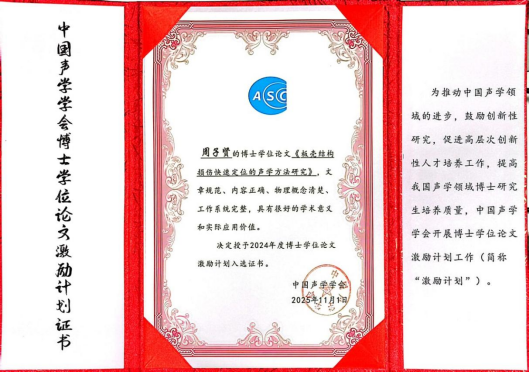 2025年11月1日,中国声学学会在2025年中国声学大会开幕式颁奖阶段举行了“博士学位论文激励计划”发布仪式。为推动我国声学领域科研创新与高层次人才培养,提升博士研究生培养质量,中国声学学会于近期组织开展了2021年至2024年度声学及相关领域博士学位论文评选工作。经过严格的资格审查、初评、终评及结果公示等环节,太阳成集团tyc7111cc声学研究团队2024届博士毕业生周子贤的博士学位论文《板壳结构损伤快速定位的声学方法研究》入选2024年度“中国声学学会博士学位论文激励计划”,他的论文指导教师崔志文教授也因在研究生培养工作中的突出成绩,荣获“博士学位论文激励计划指导教师”称号,并在2025年全国声学大会受到表彰。