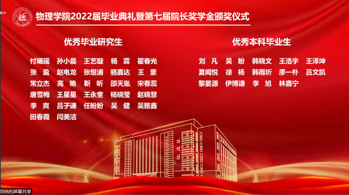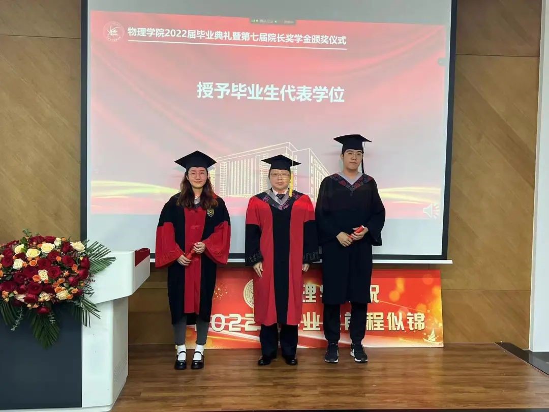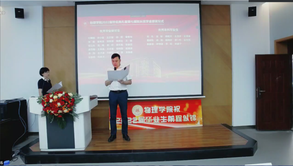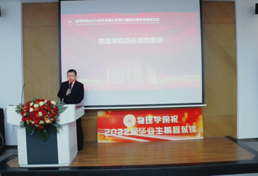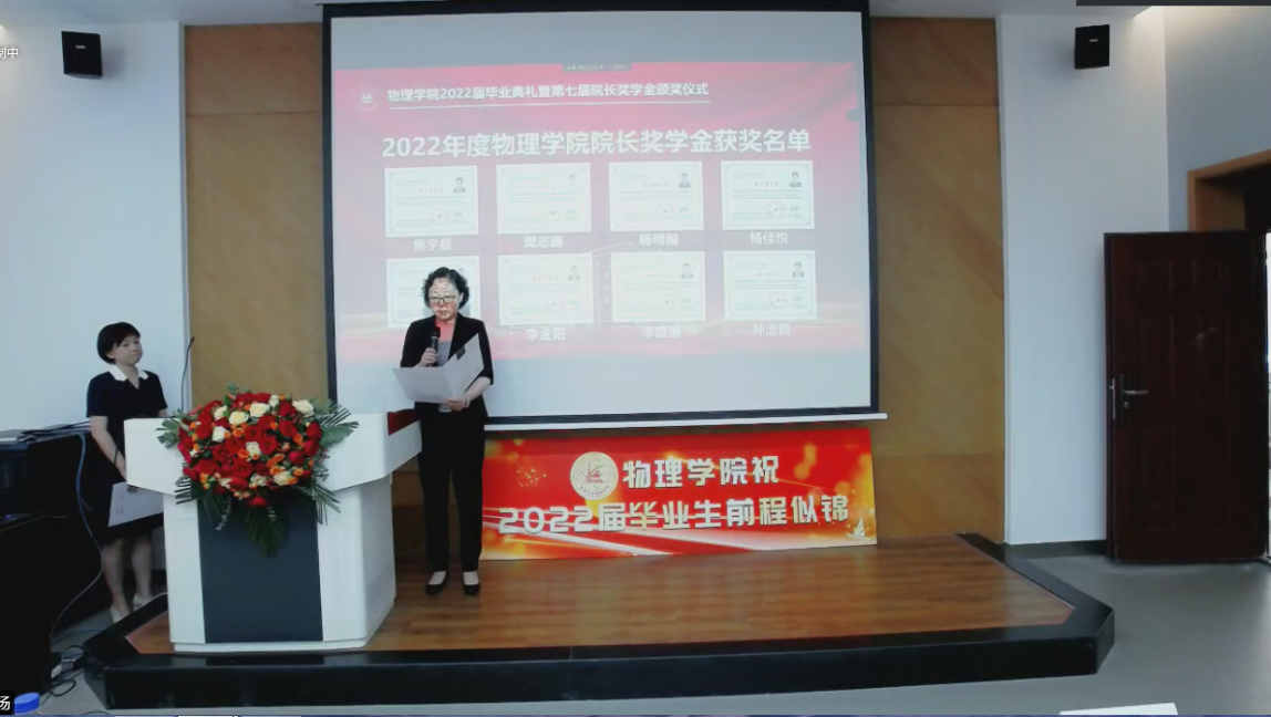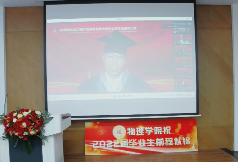 2022年6月19日上午9:00,太阳成集团tyc7111cc2022届毕业典礼暨第七届院长奖学金颁奖仪式隆重举行。太阳成集团tyc7111cc党委书记孟文卓、太阳成集团tyc7111cc院长邹勃、太阳成集团tyc7111cc党委副书记唐宗明、太阳成集团tyc7111cc副院长王海军、太阳成集团tyc7111cc副院长杜菲、太阳成集团tyc7111cc副院长杨景于物理楼参加典礼,各系主任、教师代表及全体毕业生于云端参加典礼。典礼由学院党委副书记兼副院长杨讴菡主持。