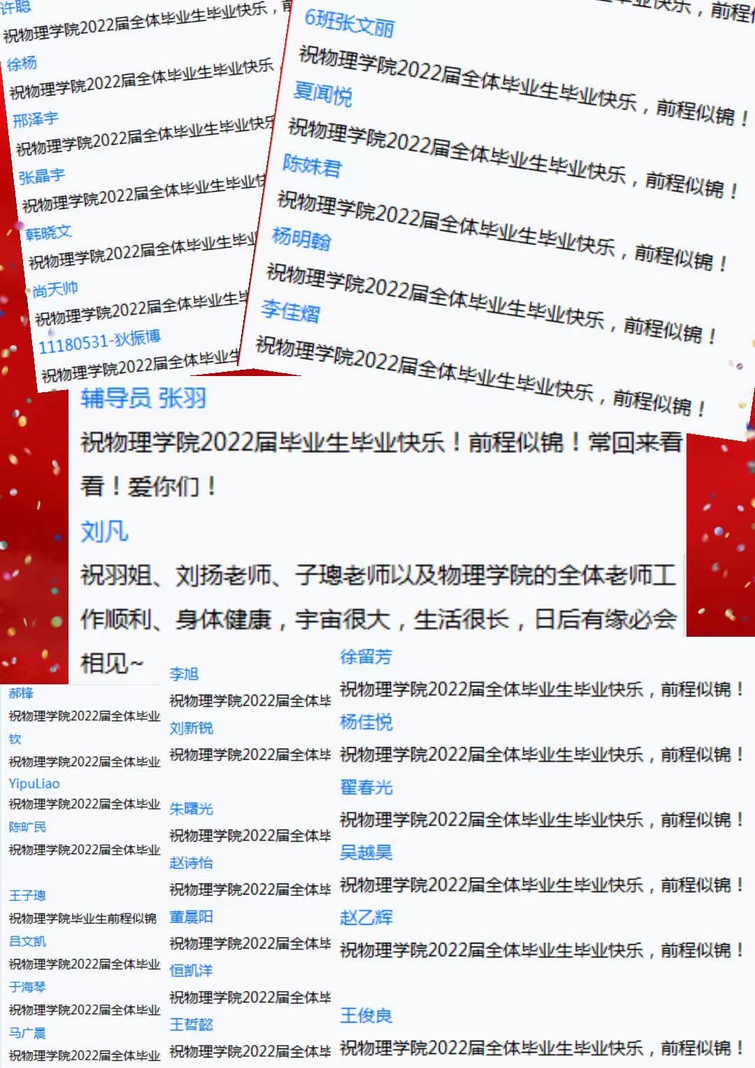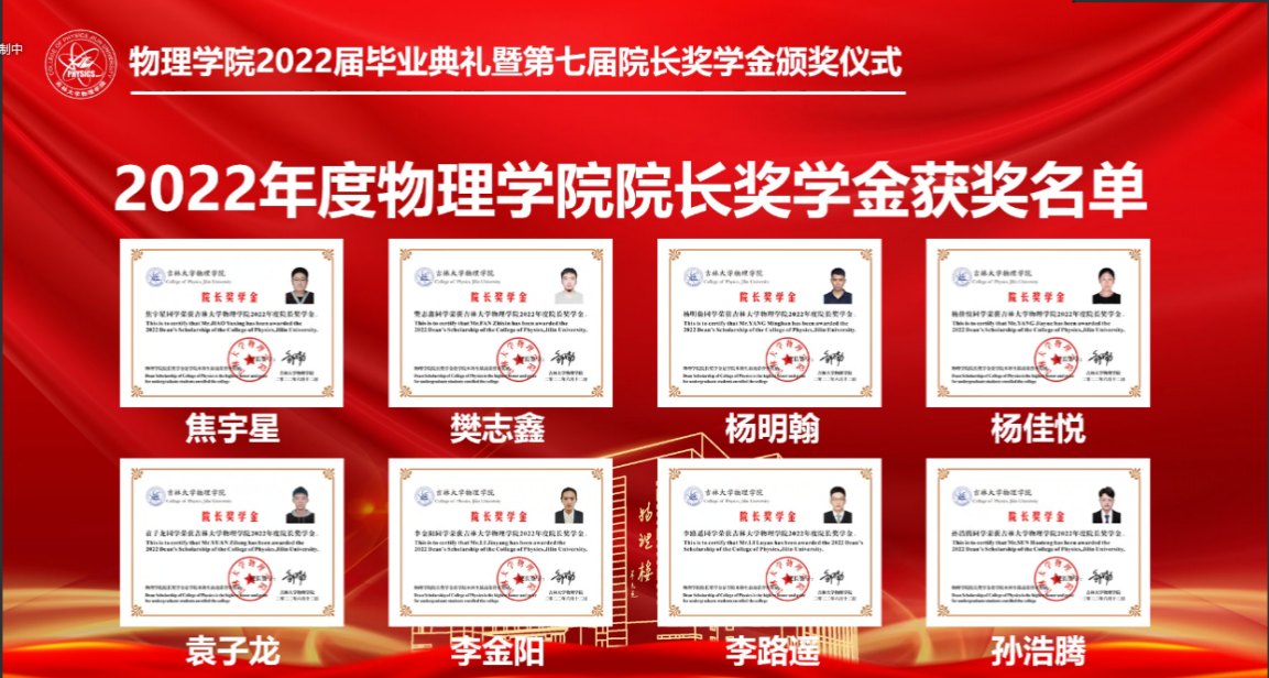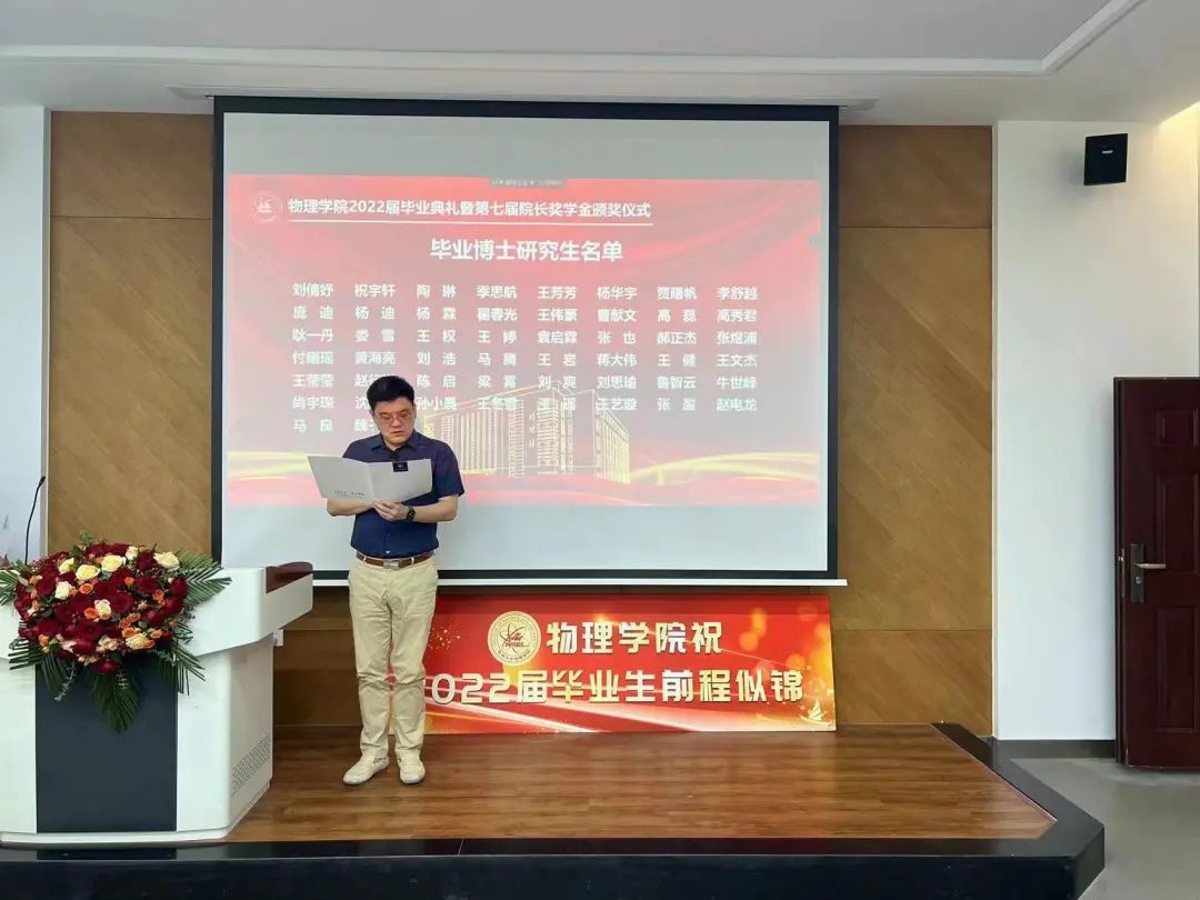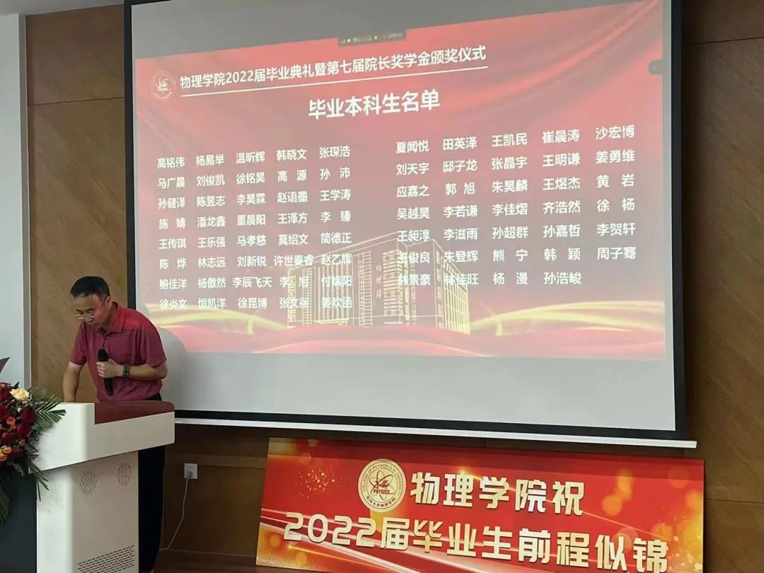 2022年6月19日上午9:00,太阳成集团tyc7111cc2022届毕业典礼暨第七届院长奖学金颁奖仪式隆重举行。太阳成集团tyc7111cc党委书记孟文卓、太阳成集团tyc7111cc院长邹勃、太阳成集团tyc7111cc党委副书记唐宗明、太阳成集团tyc7111cc副院长王海军、太阳成集团tyc7111cc副院长杜菲、太阳成集团tyc7111cc副院长杨景于物理楼参加典礼,各系主任、教师代表及全体毕业生于云端参加典礼。典礼由学院党委副书记兼副院长杨讴菡主持。