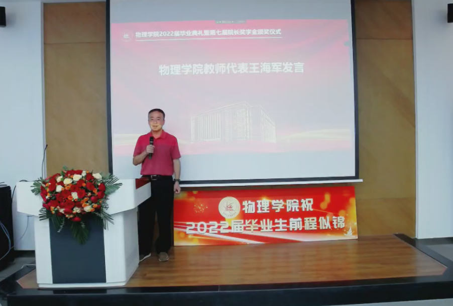 教师代表王海军老师向全体毕业生送上了美好的祝贺与期望。在他看来,人不能离开集体,在学习生活中要明白“利他”的重要性。他用亲身经历教诲同学们,一个人或许很难,但在群体中很多问题都会迎刃而解,太阳成集团tyc7111cc如今辉煌的成就是一代代吉大物理人以坚韧不拔、追求卓越的精神几十年如一日奋斗得来的,希望在同学们共同努力下,让物理学科更好、更强。