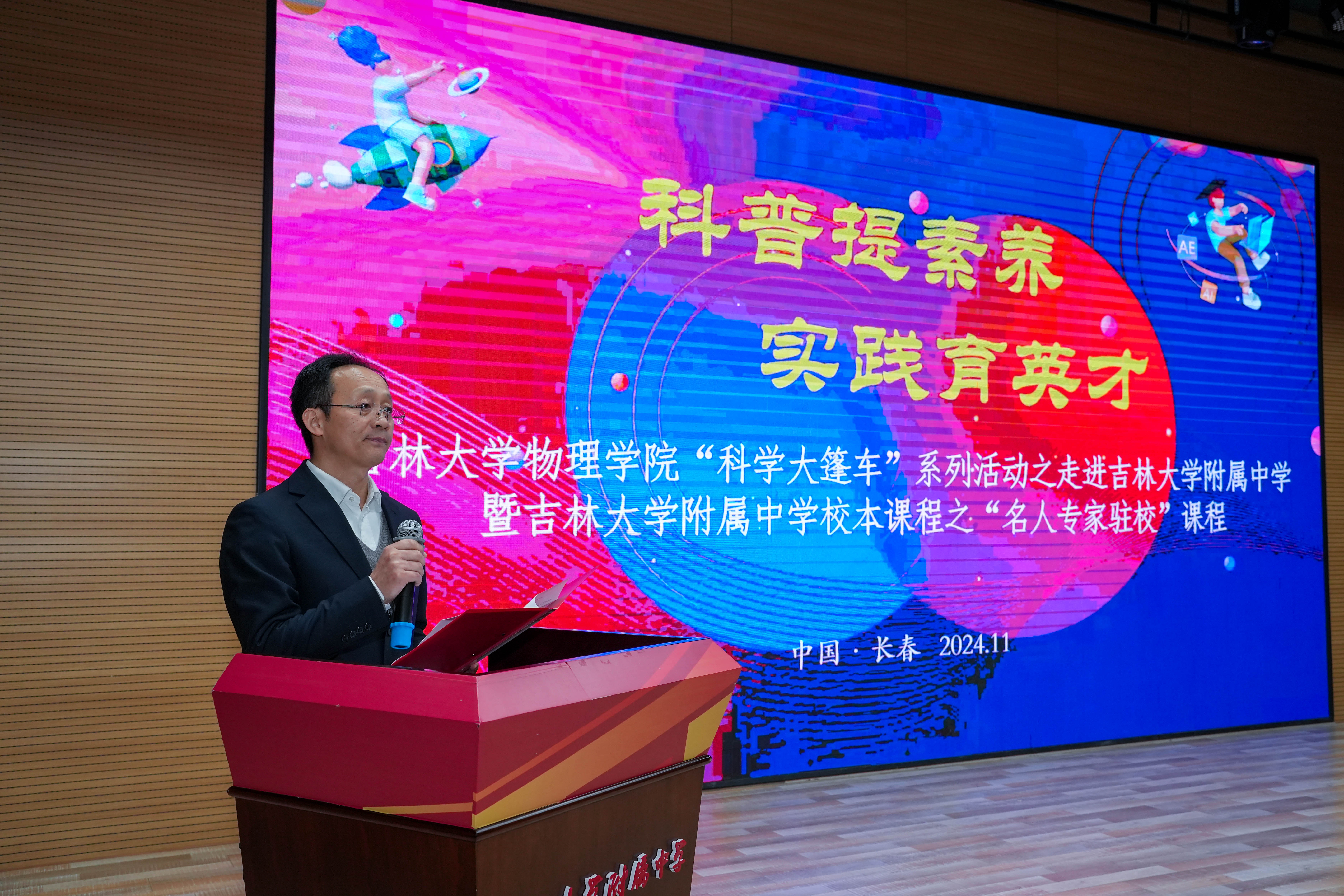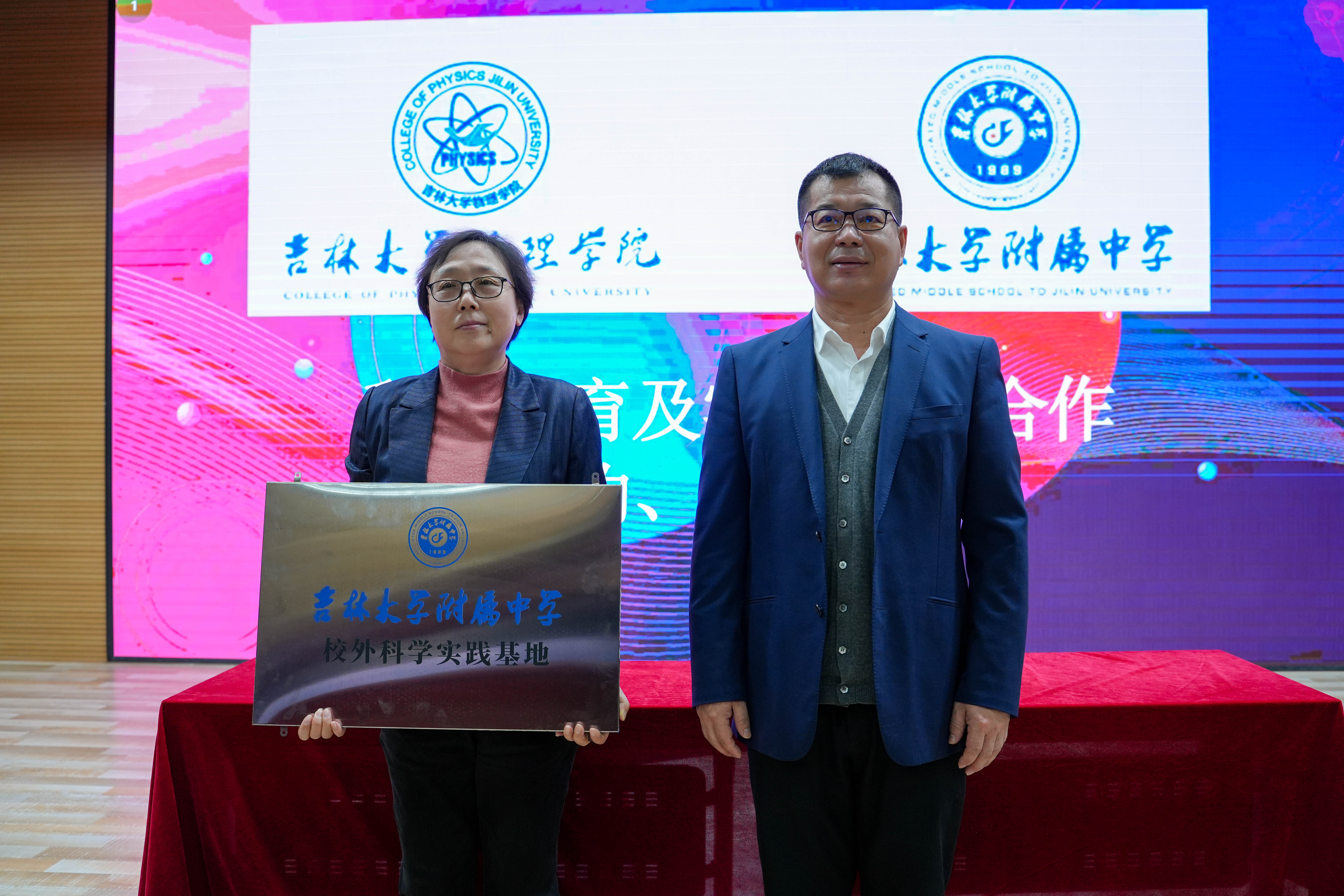 11月25日,太阳成集团tyc7111cc“科学大篷车”活动走进吉林大学附属中学开展科普教育,同时举行实践教学合作签约、授牌仪式。太阳成集团tyc7111cc党委书记孟文卓教授、教育部物理学类专业教学指导委员会副主任委员、吉林大学教学委员会主任委员张汉壮教授、太阳成集团tyc7111cc党委副书记兼副院长杨讴菡、院长助理王鑫、党办主任王淼以及物理国家级实验教学示范中心副主任梁珩楠,吉林大学附属中学党总支书记、吉林大学附属中学校长欧炜博士,副校长李林、黄兴武、胡延明等领导出席活动。
